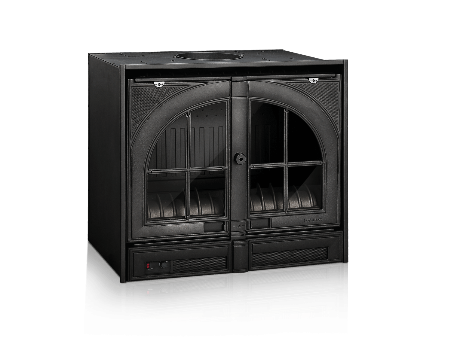 De voorzijde van inzethaard Abodi heeft een klassiek ontwerp met gezellige ruiten. Hierdoor houdt de haard het midden tussen een open haard en een kachel. Abodi is echt een sfeermaker in uw kamer. De haard heeft de extra optie om de deuren in de zijkant te laten verdwijnen bij het openen: P/E.