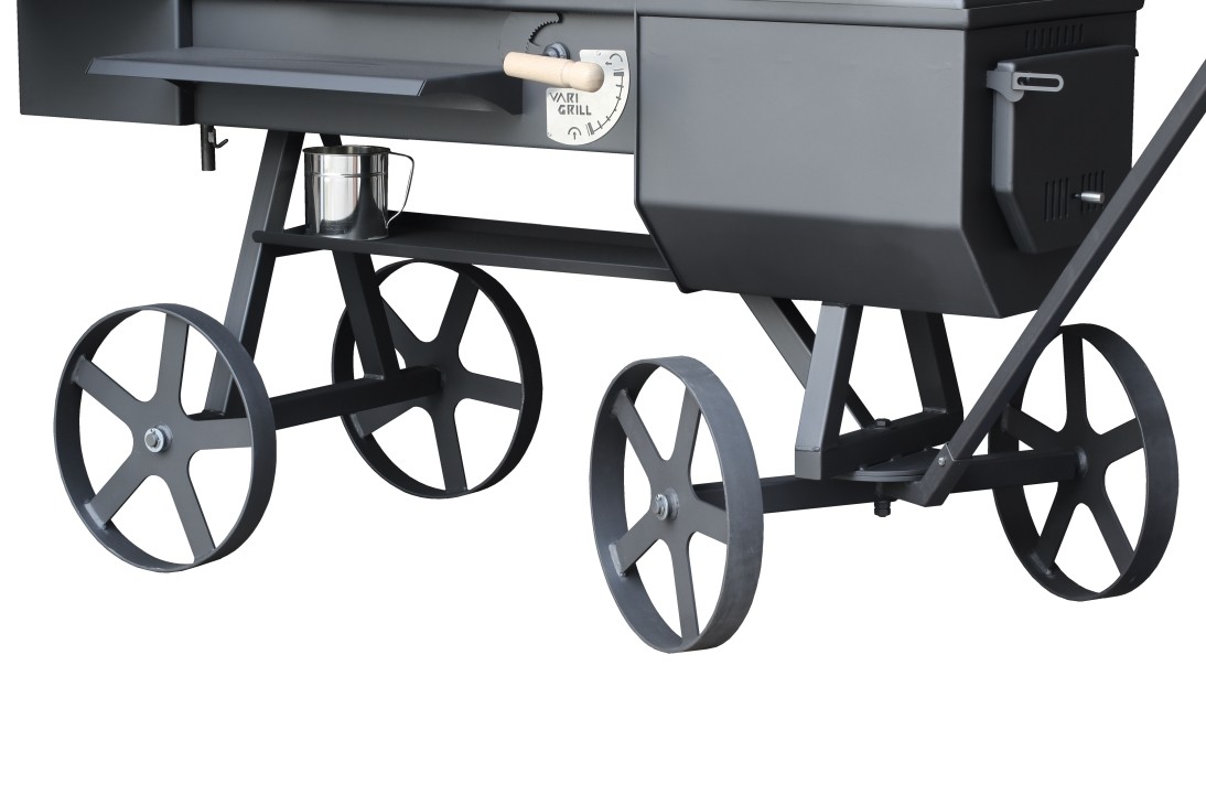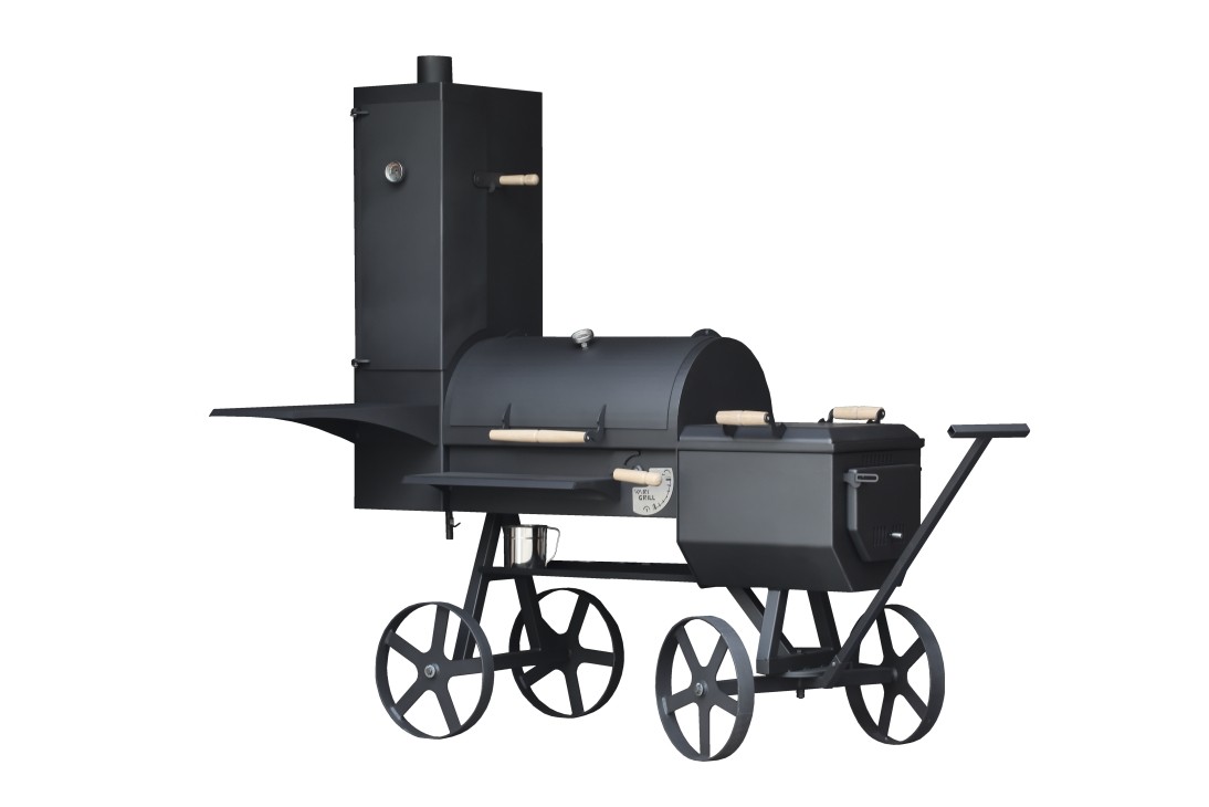 Met de basisversie + oven versie van de Locomotief grill kunt u een dessert of brood klaarmaken in de oven terwijl u tegelijk aan het grillen bent. Het doel van de grill is het combineren van een binnen keuken en het buiten bereiden van eten. Dankzij deze combinatie is het mogelijk om verschillende gerechten met verschillende smaken, snel en tegelijk te bereiden voor meerdere mensen. Het gebruikt van deze grill is eenvoudig en veilig. Het materiaal is robuust en heeft een lange levensduur, mede dankzij het gebruik van 5mm dik plaatstaal. De verbrandingskamer is voorzien van vuurvaste stenen a 25mm dik. Het vuur in de verbrandingskamer is uitstekend te regelen doormiddel van de luchttoevoer. U kunt er voor kiezen om het alleen maar te laten gloeien of dat u de vlam in de gril wilt. De grill wordt geleverd met een thermometer die een bereik heeft van 40 – 260° graden Celsius. De grill heeft standaard wielen voor het verplaatsen. De grill is voorzien van een hittebestendige kleurcoating. De rookoven is bevestigd aan de grill body. De directe toevoer van rook is onderin de smoker geplaatst (het laagste gedeelte). Zodoende is de rook gelijkmatig verdeeld door de Smoker ruimte. Voor regeling en het snel afvoeren van de rook is er een losse afzuigkamer welke rechtstreeks is verbonden met de grillruimte.  Grill en de rookoven worden beide geleverd met een thermometer met een bereik van 40-260° graden Celsius. De grill heeft wielen voor een eenvoudige verplaatsing. De grill is voorzien van platen voor het berieden van gerechten en alle onderdelen zijn voorzien van een hittebestendige kleurcoating.